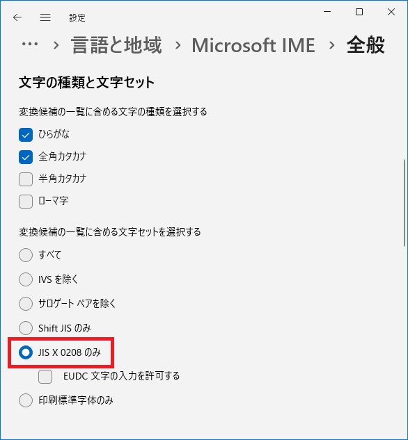 日本語入力用IMEでの変換対象を「JIS X 0208」に制限します。